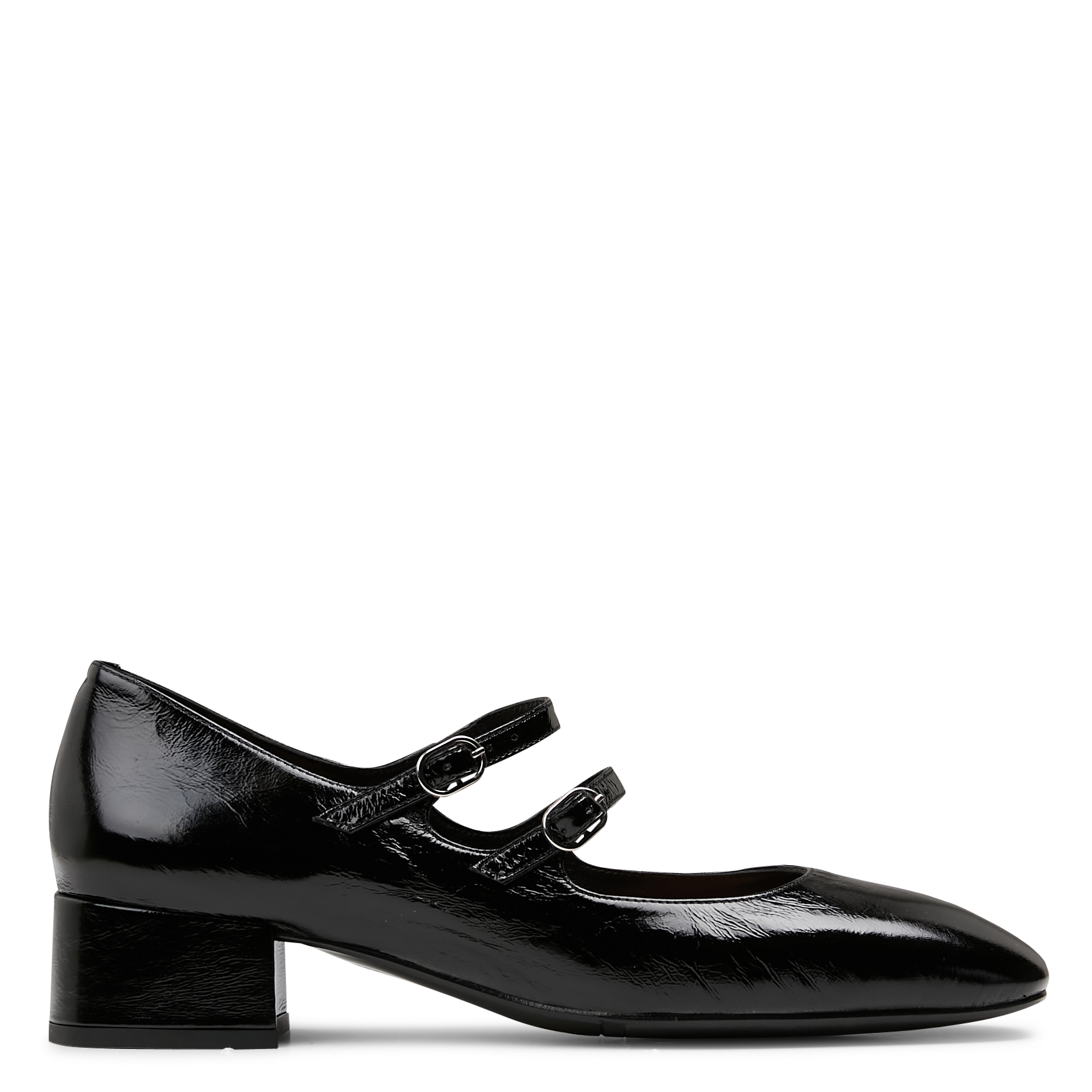 - Der Schuh ist mit zwei Riemen über dem Spann gestaltet, die mit Schnallen befestigt sind.