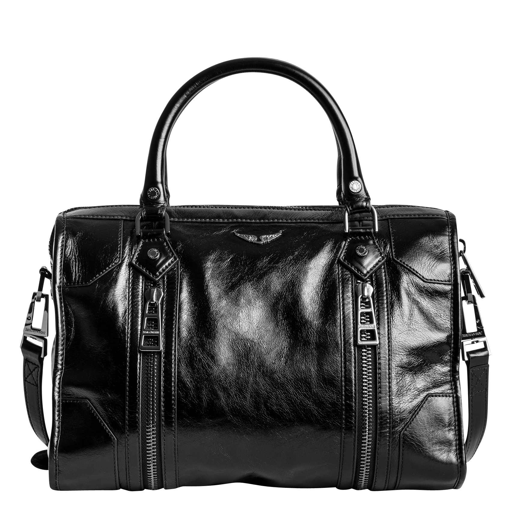 Zwarte leren handtas voor dames in vintage stijl van Zadig & Voltaire, een iconisch model, gestructureerd en functioneel, te dragen in de hand, over de schouder of gekruist, verstelbare en afneembare schouderriem, twee ritssluitingen om de tas te vergroten, een opgestikte zak en een ritszak aan de binnenkant.