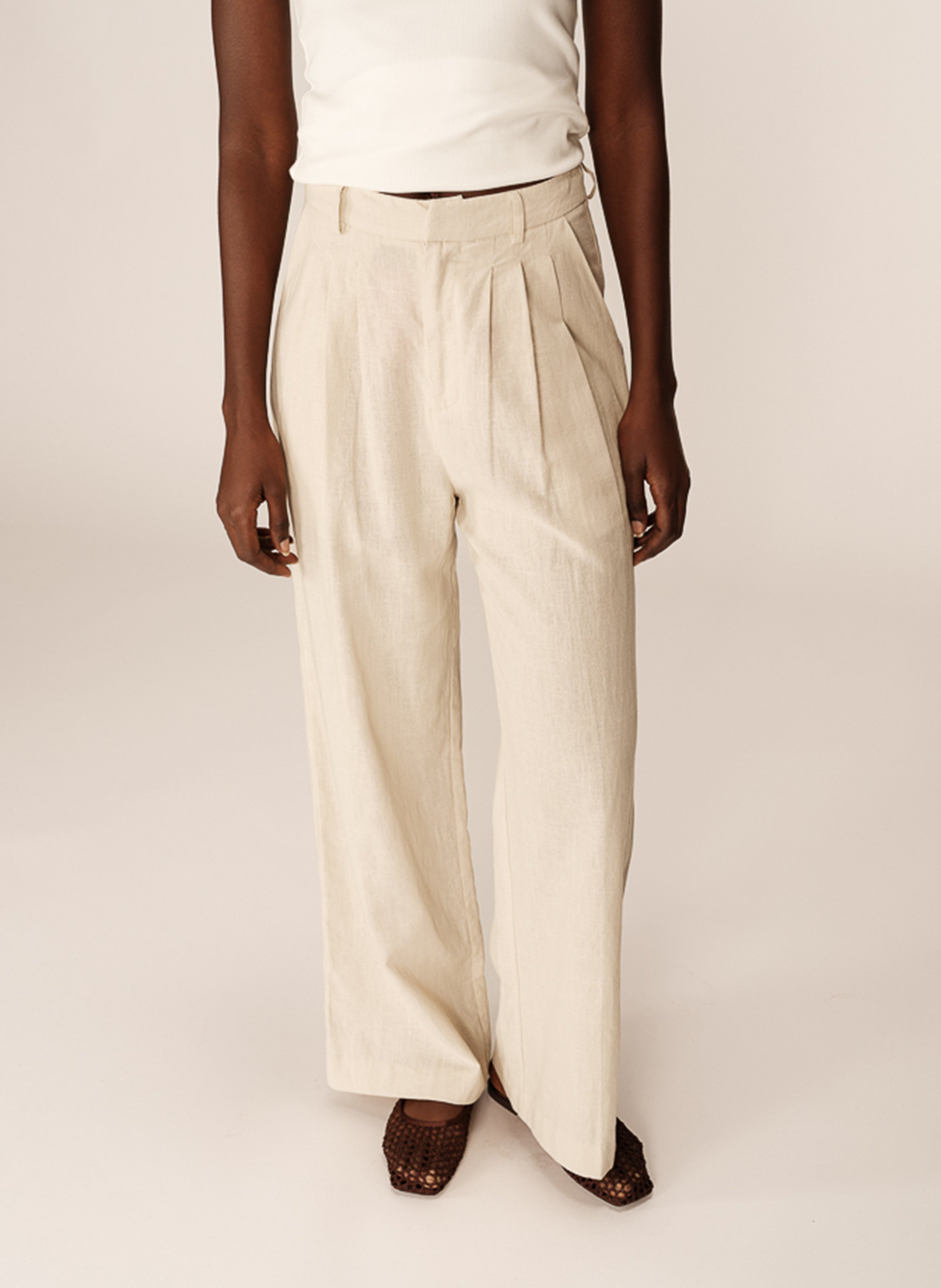 - Hose aus Leinen und Baumwollmischung - Gerader Schnitt und weites Bein - Hohe Taille - Gürtelschlaufen - Verdeckter Reißverschluss mit Hakenverschluss - Eingrifftaschen vorne - Scheintaschen hinten - Falten vorne