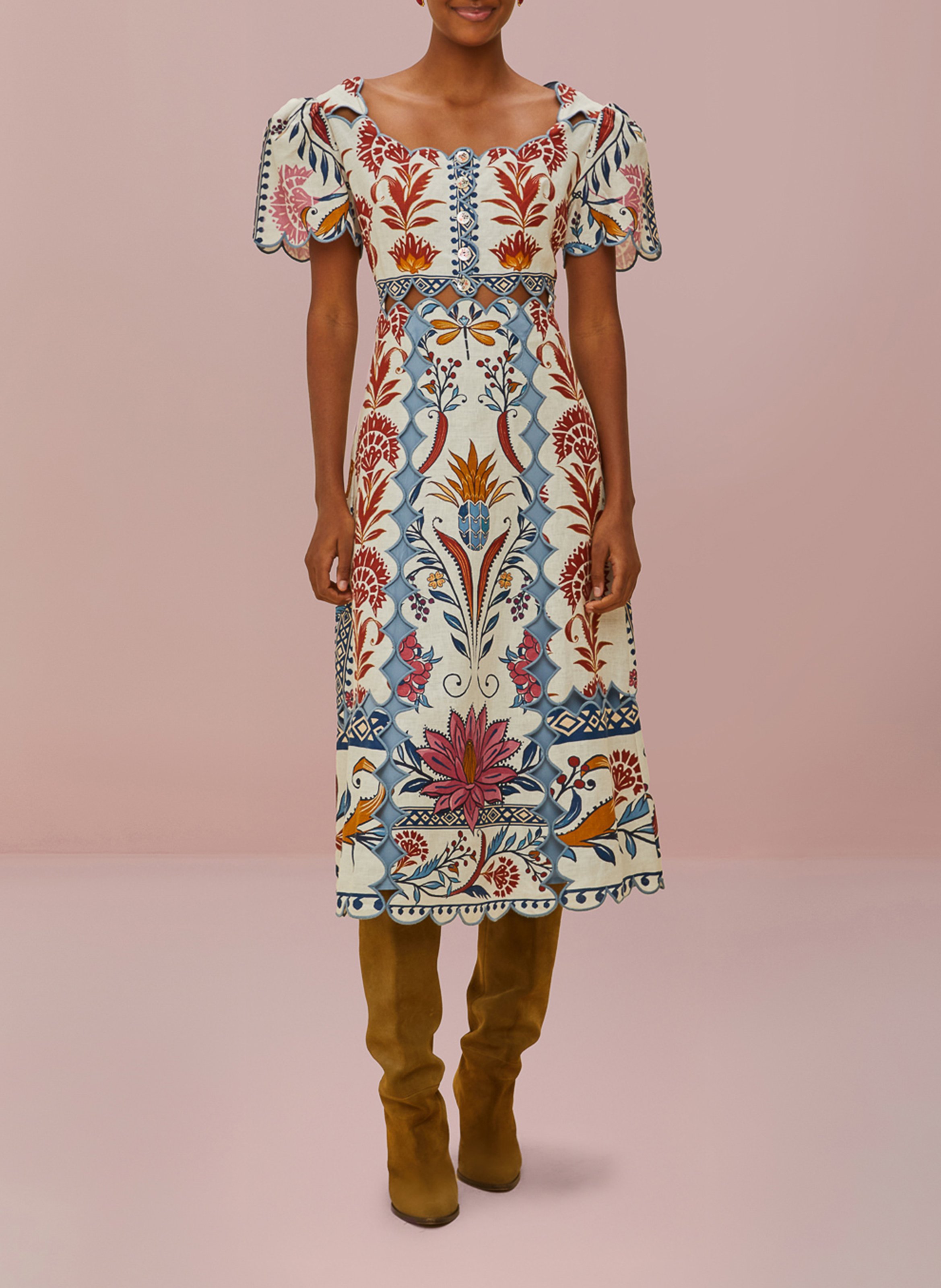 farm rio Long printed round-neck dress - Beige