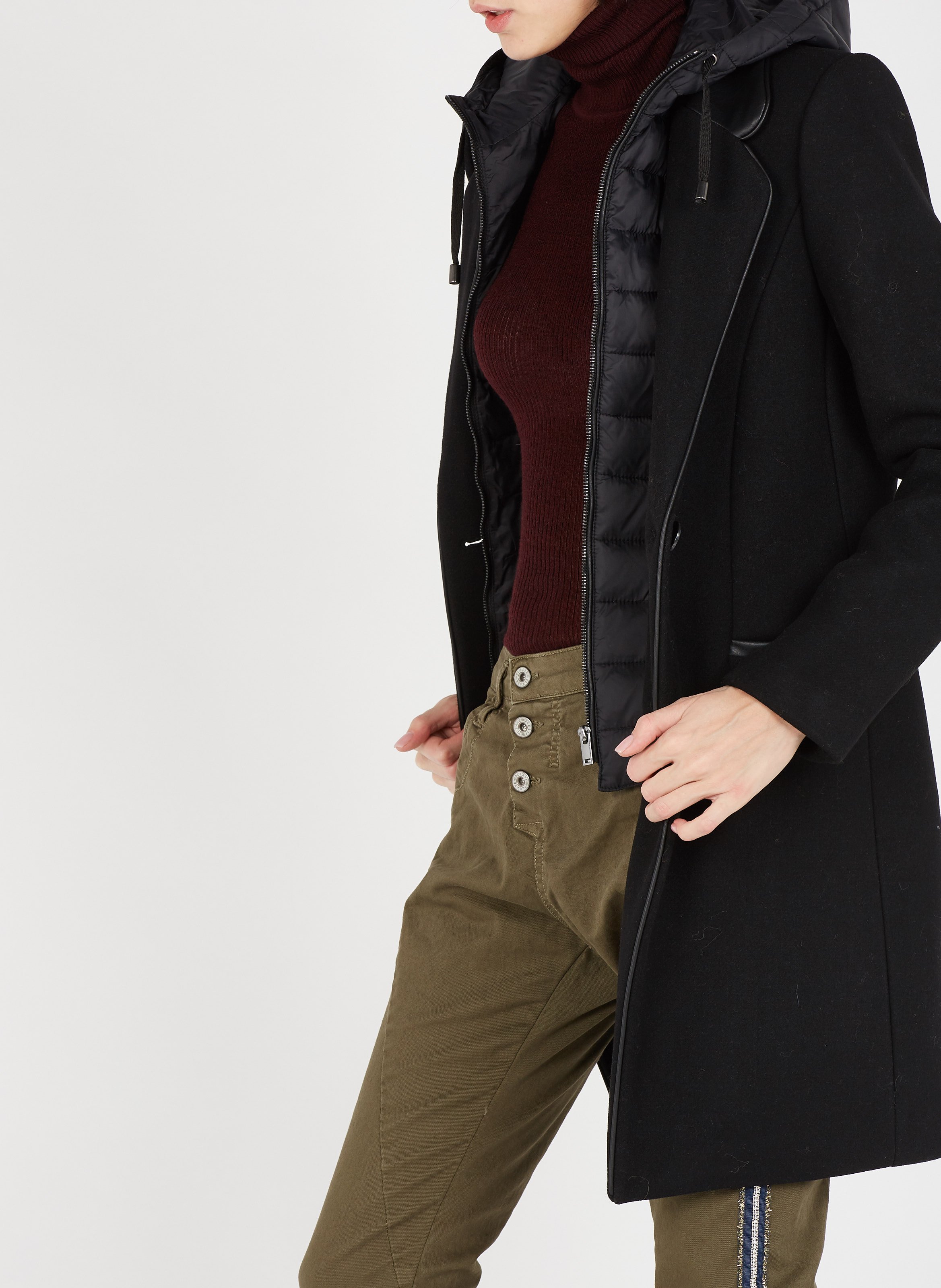 The DIDA coat combines elegance and comfort. In wool blend and mid-length, it features a straight cut with an enhanced shawl collar. The surprise comes from the inside! A quilted lining in a tone-on-tone down jacket style with a stand-up collar and hood, a real barrier against the cold!