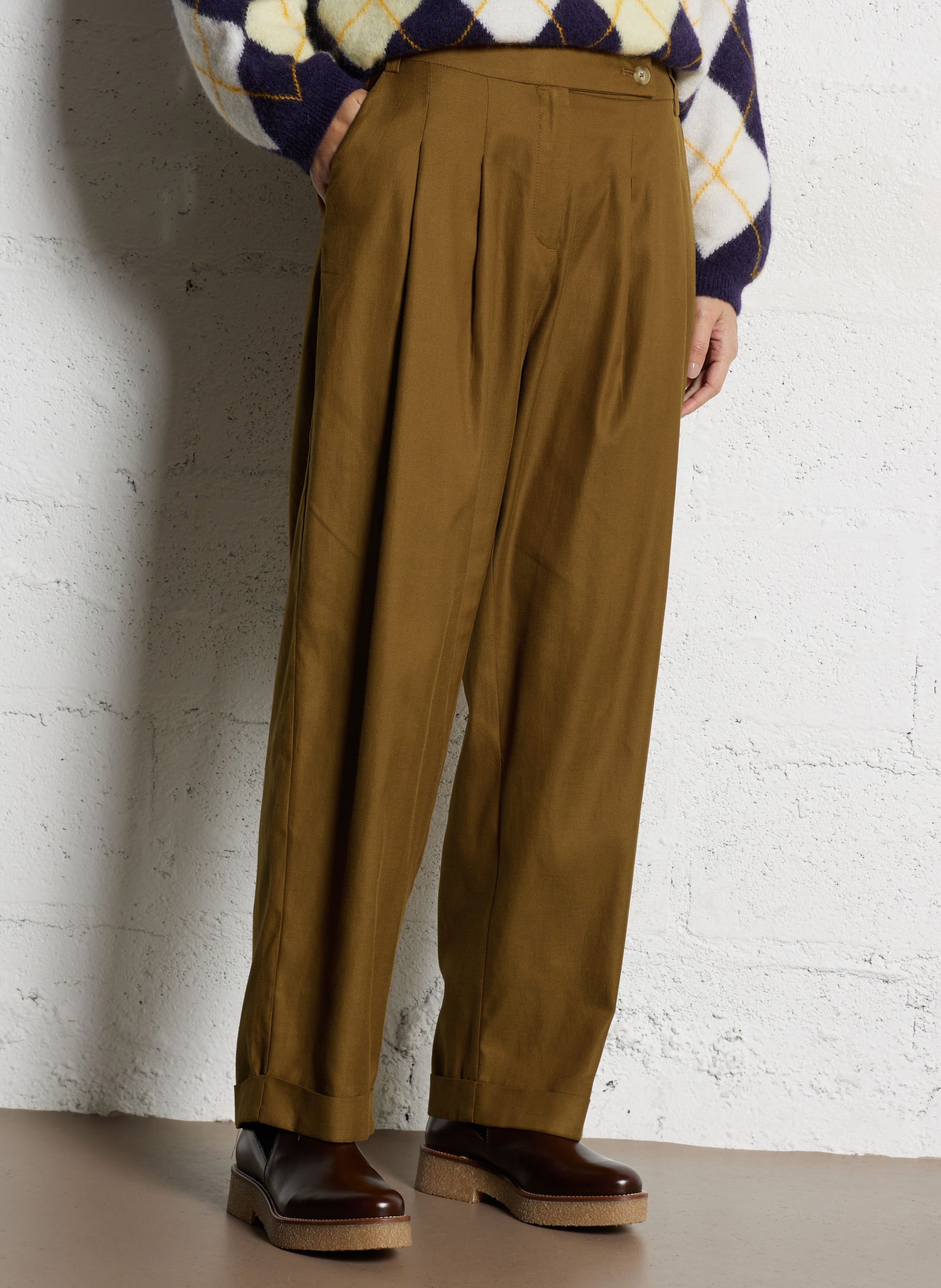 These wide-leg pants stand out for their adjustable waist, elasticated at the back for added comfort, and fixed cuff at the bottom of the leg which structures the drape. The zip closure with buttons and pleats under the belt emphasize the line, while the Italian pockets add a practical and urban touch. Made from a subtle chevron blend of lyocell and cotton, with a soft, supple, and round touch, for a feeling of lightness and a fluid look. A COTELAC essential, between natural elegance and everyday comfort.