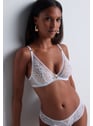 Triangle Plunge Fusion. Triangle-shaped underwired bra combining the Triangle Plunge and Triangle Plunge Comfort styles. It features a very seductive and reassuring plunging neckline. Suitable for larger cup sizes with a chimney back depending on the sizes, providing perfect support up to cup size F. Benefit: a deep neckline and a material that elegantly dresses the cleavage.