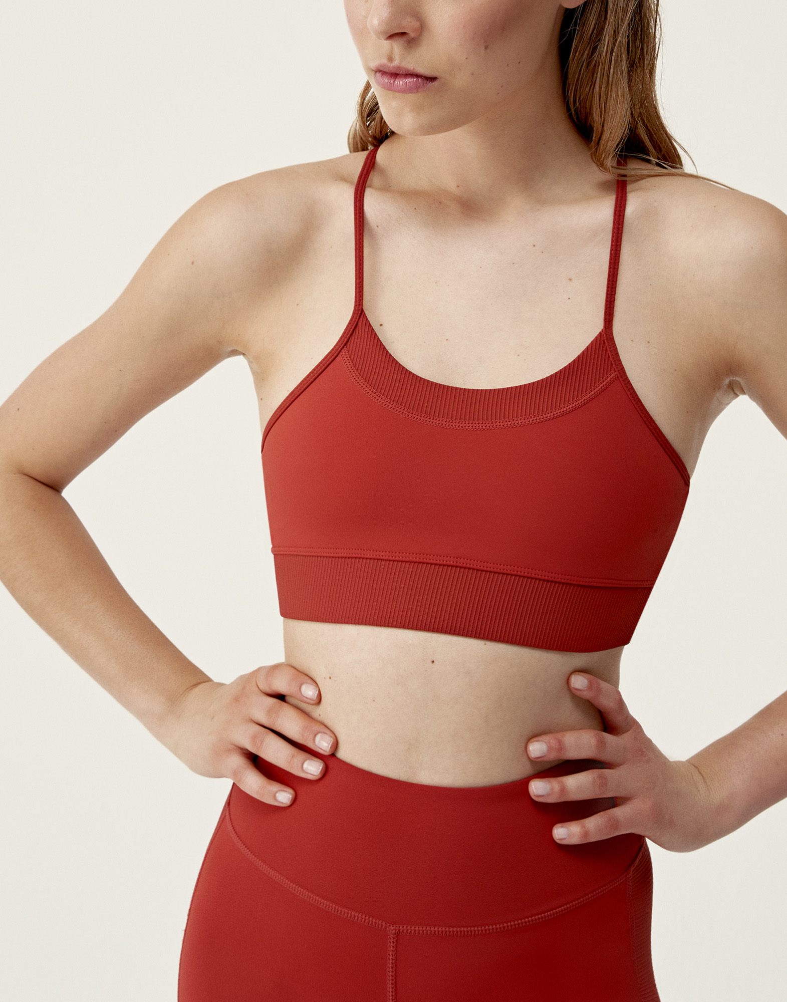 Medium support sports bra. It combines two premium fabrics: smooth and ribbed effect. Thin straps and U-neckline. Durable fibers Four-way stretch fabric Soft touch Quick-drying Antibacterial Antistatic Medium support Removable pads This product is recyclable up to 70%