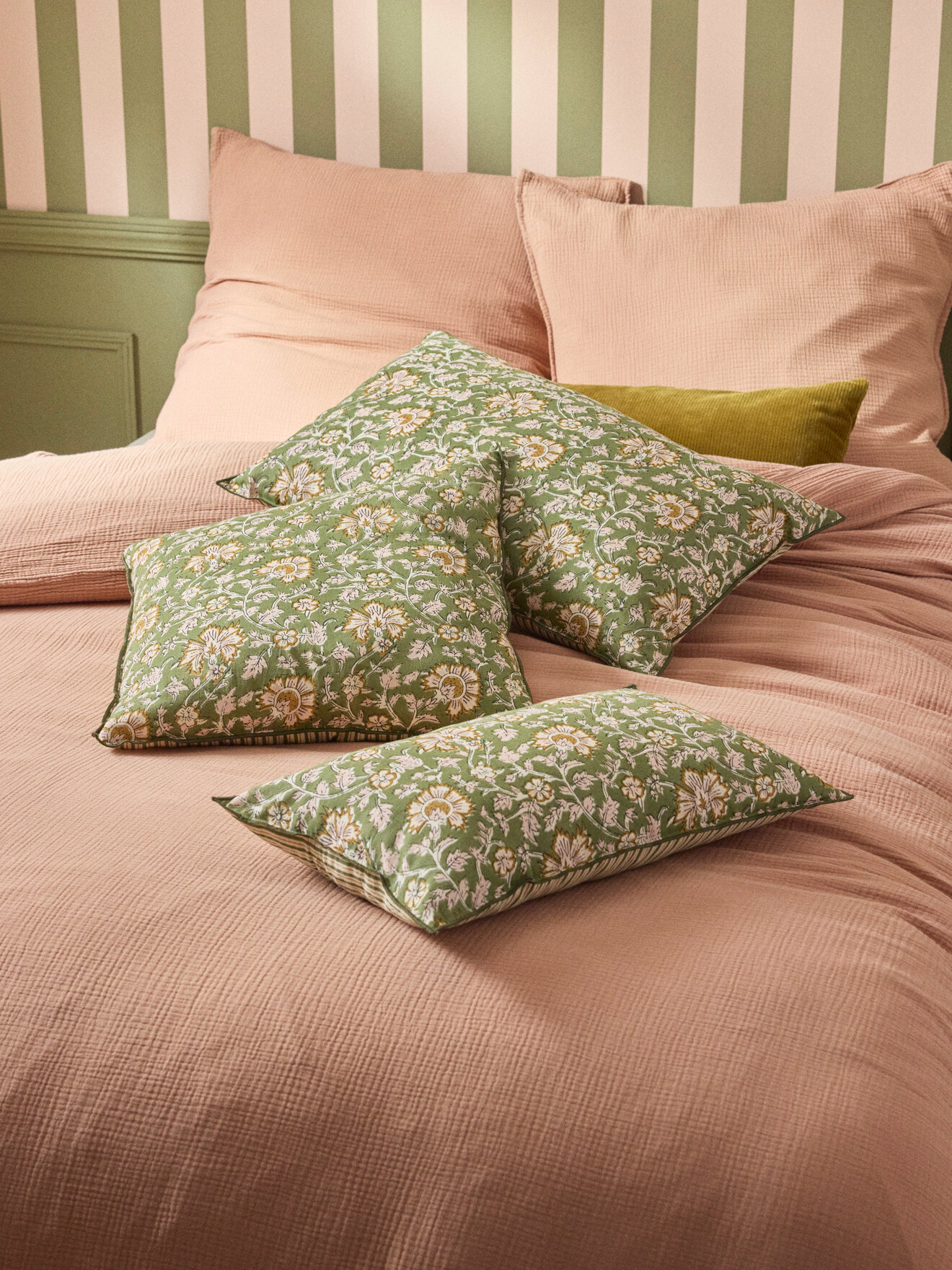 This season, our Indian fabric cushion cover is evolving. It shares the spotlight with a beautiful striped print. Reversible cushion cover edged with a green blanket stitch and closed with an invisible zipper. 2 Indian floral prints to choose from: Anika and Amali. Filling cushions are sold on our website.