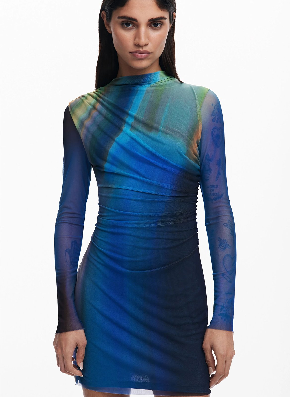 Short dress with long sleeves and high neck in micro tulle with draped front and watercolor print.