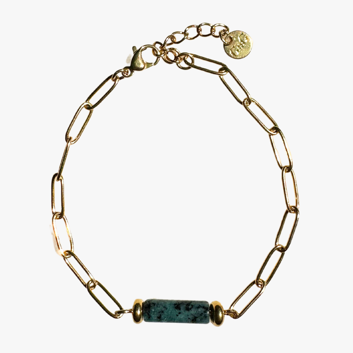 Stainless steel bracelet, adorned with gold-plated charms and a turquoise stone. Measures approximately 16+2cm. Delivered in a scented pouch.