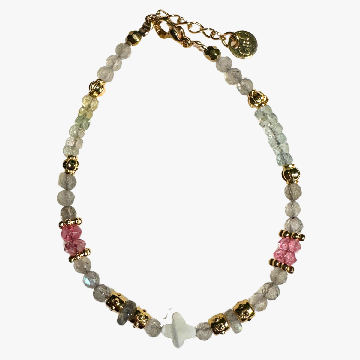 Bracelet made of labradorites, pink topazes, fine gold charms, and a mother-of-pearl clover. Measures approximately 16+2cm.
