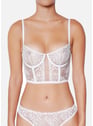 This bustier stands out with its exceptional French floral embroidery and transparent tulle at the front, creating a seductive and sophisticated look. The Italian silk adds a touch of luxury, providing this piece with a soft texture and a perfect finish.