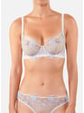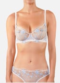 Dive into absolute elegance with this exceptional bra, combining refinement and comfort. Crafted from an unparalleled Swiss embroidered lace, delicately marrying airy ivory tulle with sky blue floral embroidery for a touch of poetry and femininity.