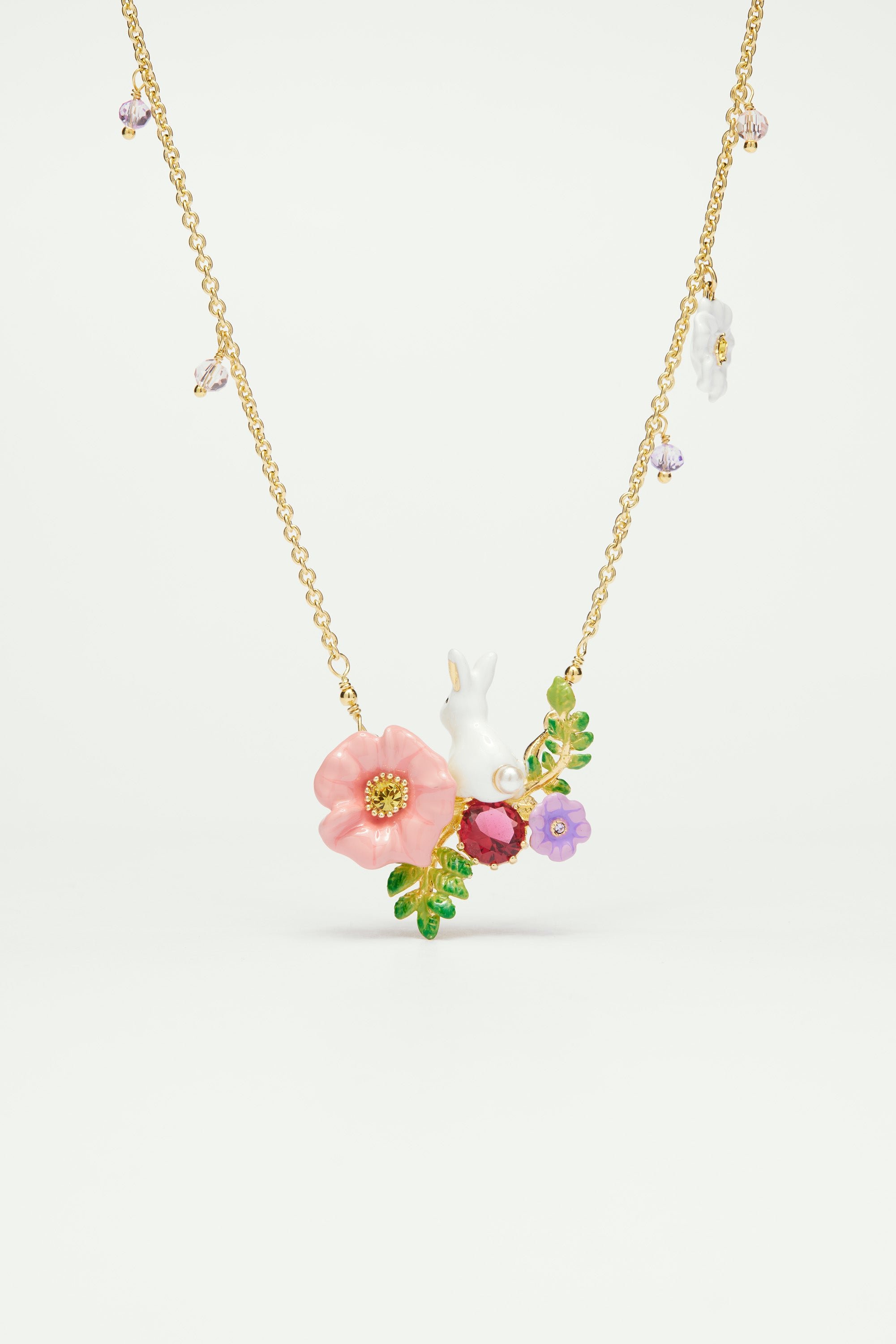 Whimsical elegance for this delicate necklace for women, or the combination of this charming white rabbit and these flowers offers a refined handmade designer jewelry piece from its new Enchanted Encounter Collection.