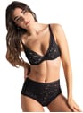A padded plunge bra with a scarf shape, slightly lined to provide additional support. Its back is made of microfiber for comfort and a smoothing effect. Its material is mainly a bold floral lace, soft, elasticated, and ethically compliant. A graphic elastic to enhance the body's curves.