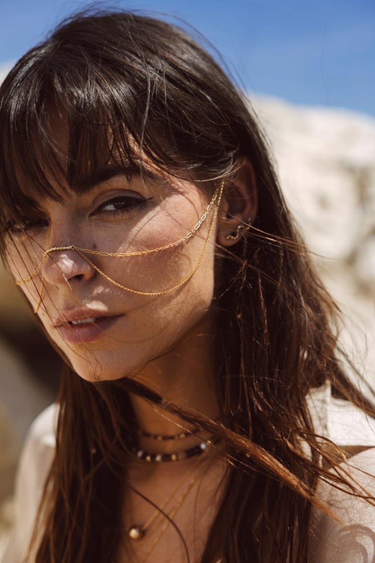 Two delicate chains highlight the gaze and gently cross the face, resting perfectly on the bridge of the nose.