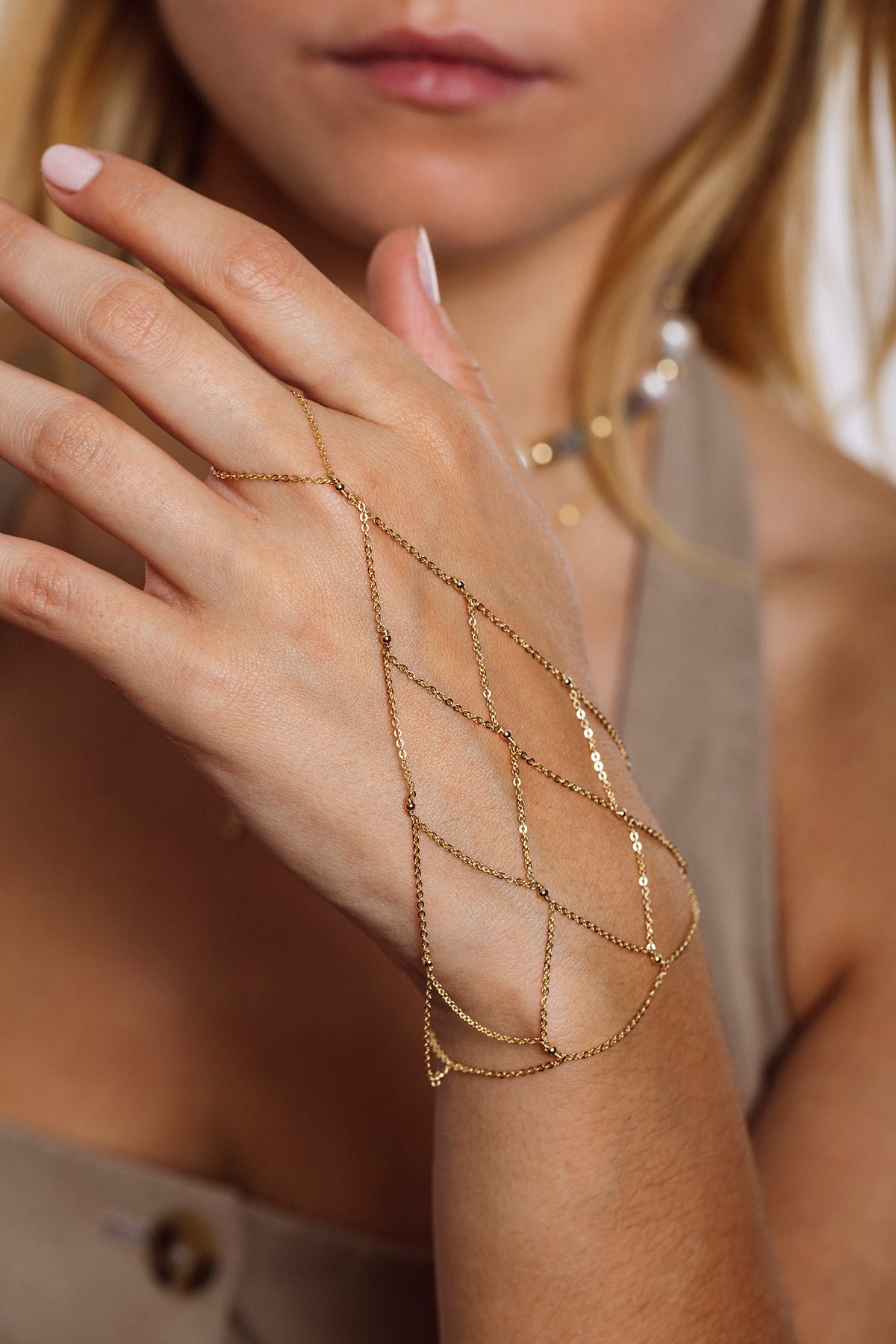 A signature piece that adorns the hand like golden lace, fine and airy, or a delicate, protective, and lightweight armor.