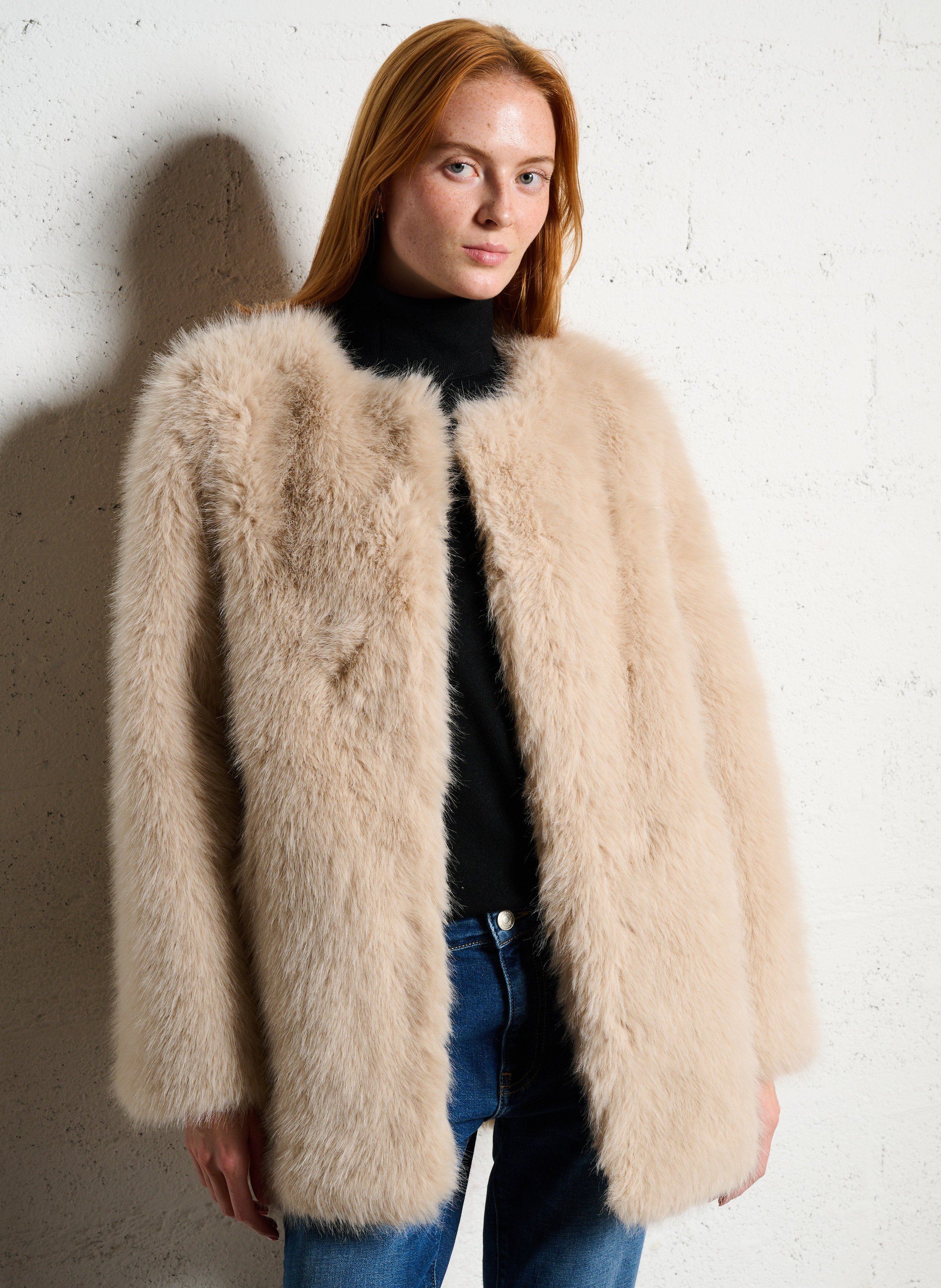sud express Veste droite col rond en fourrure synthétique - Beige – VIDAL