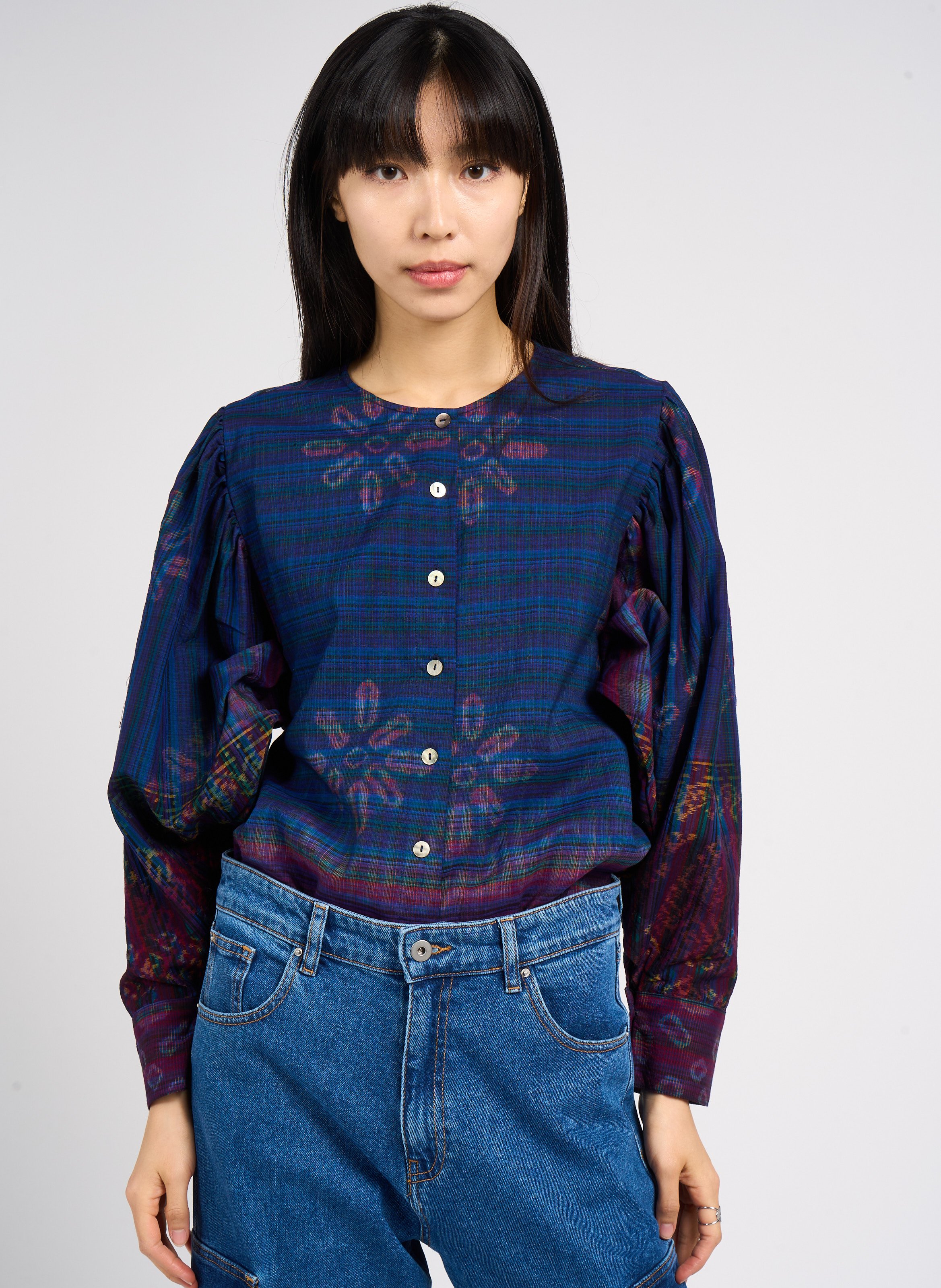 v de vinster Chemise col rond imprimée en coton - Bleu – NILAI IKAT